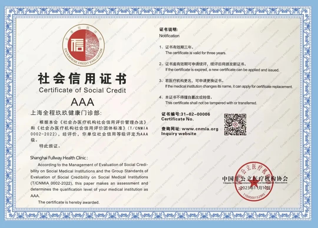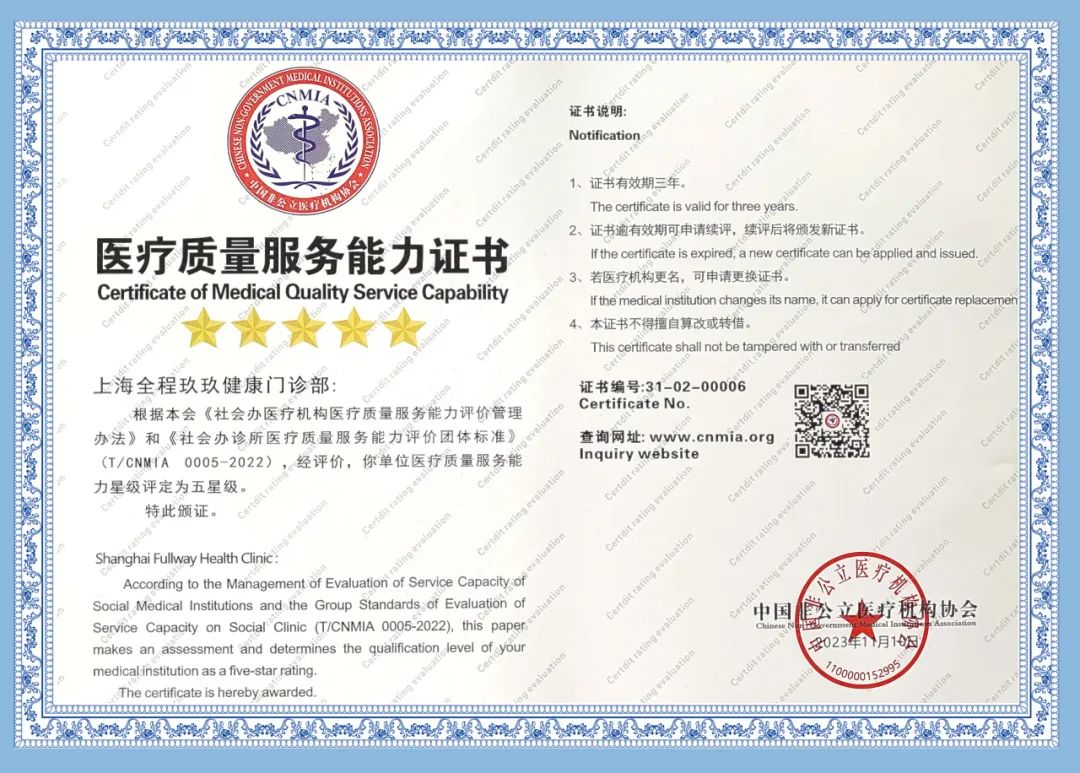 此次榮獲“雙評”工作的最高榮譽也意味著全程玖玖健康門診部的信用建設和服務能力納入了非公醫療的國家標準體系,體現了門診部在醫院管理、醫療質量,醫療服務等方面都處于非公醫療行業的領先地位。